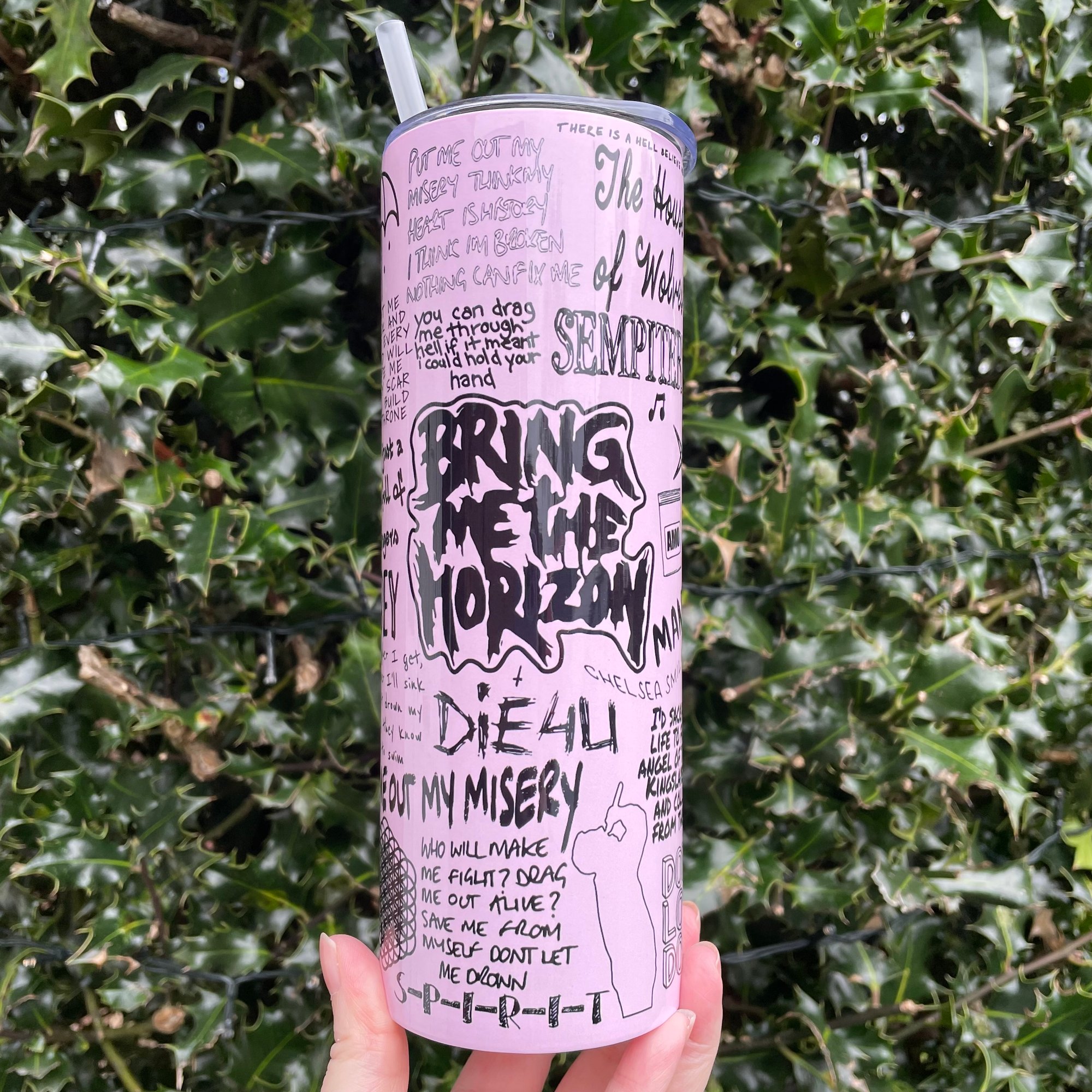 Pink Bring me the horizon inspired stainless steel tumbler. Sublimated design. 20 oz tumbler for hot or cold drinks, the double walled tumbler keeps drinks hotter or colder for longer. Comes with push on lid and straw.